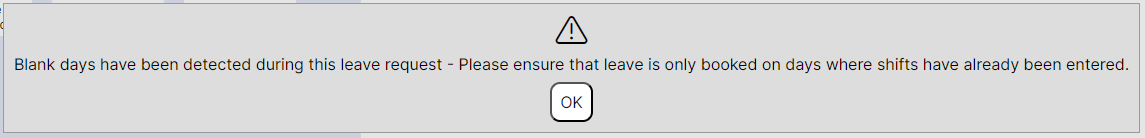 HANDY HINT - If your rota has not been generated for the dates of absence you are requesting, the system cannot determine the number of days or hours to subtract from your annual leave or lieu balance, and therefore you will receive a message as per the above example. Please speak to your manager who can then assign your shifts to the rota, and you can then re-submit your request.