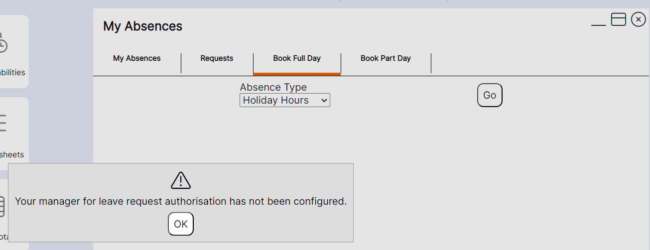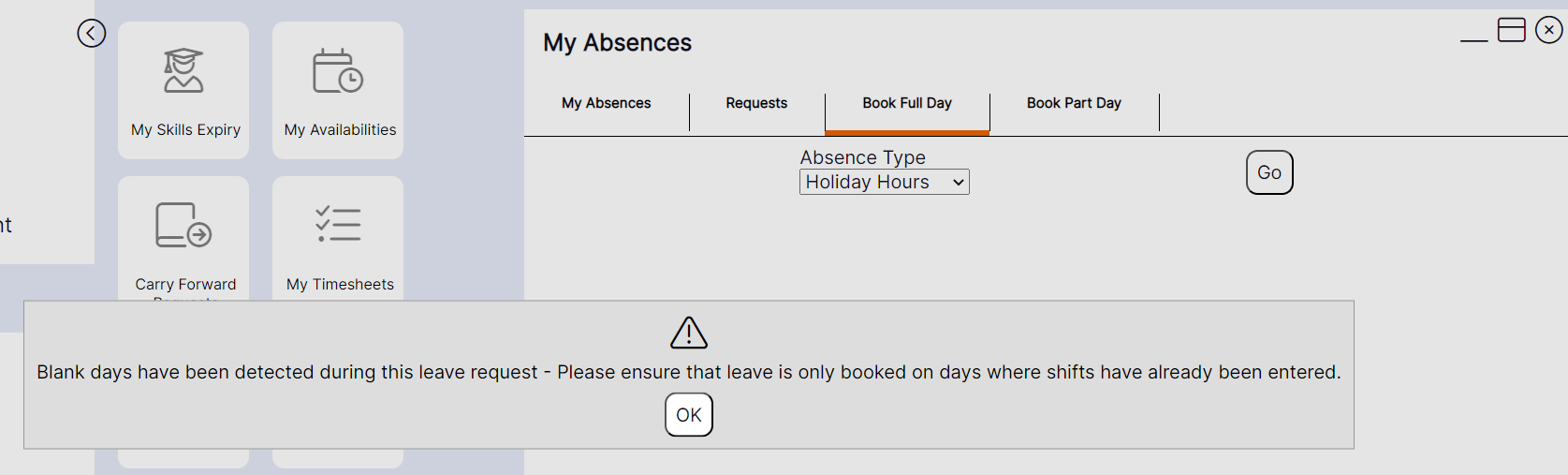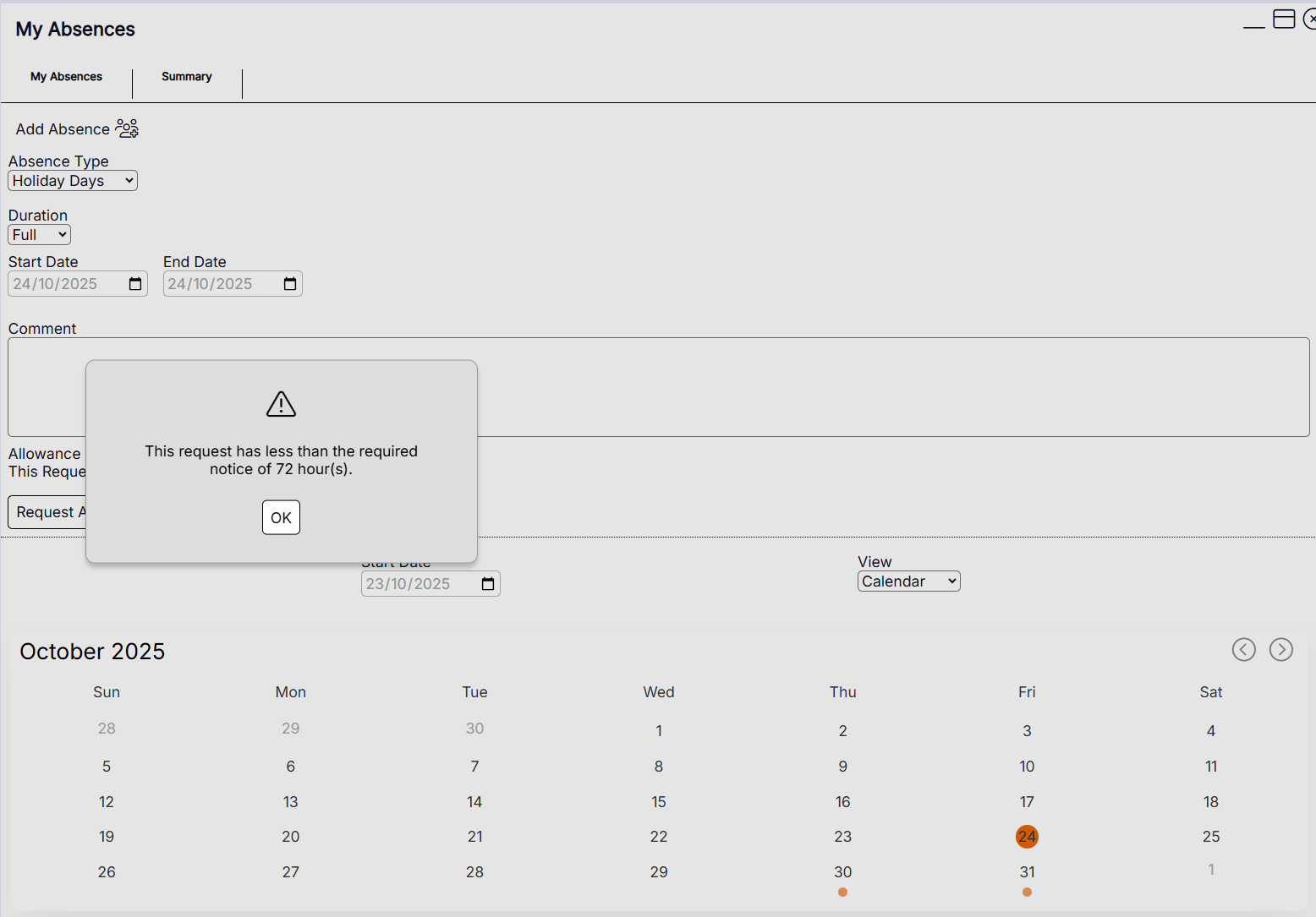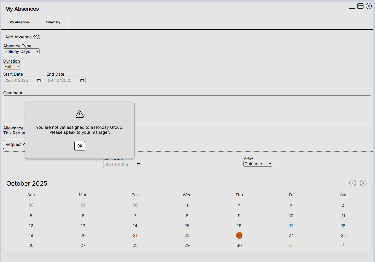 HANDY HINT - If you have not yet been assigned to a holiday group, this means the system cannot determine if there are enough slots available for you to submit an absence request. (I.e. cannot determine how many staff are currently off on these dates to check if your request is valid).