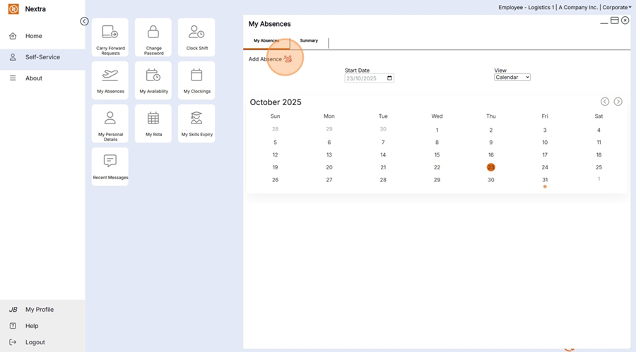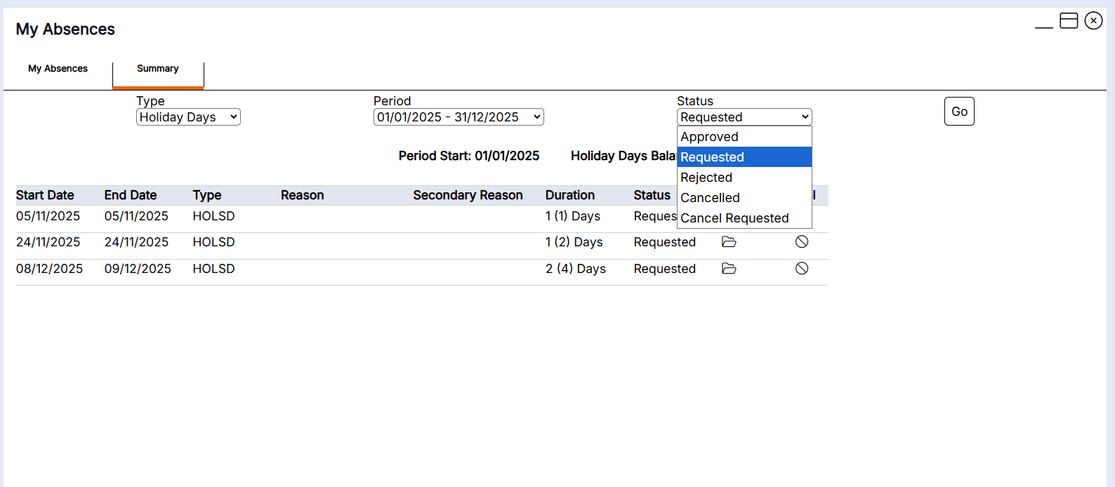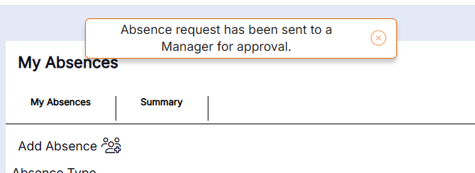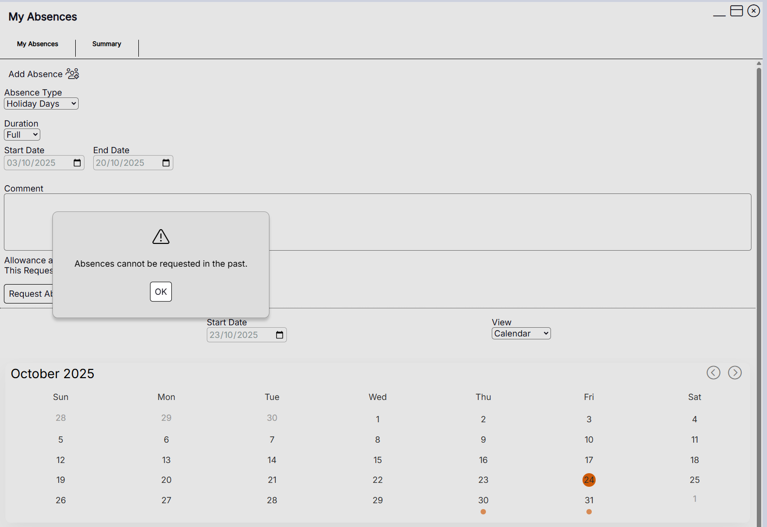 HANDY HINT - The system will not allow you to make a request for absence in the past. If for any reason an absence request needs to be booked in the past, your manager will need to do this manually on your behalf.