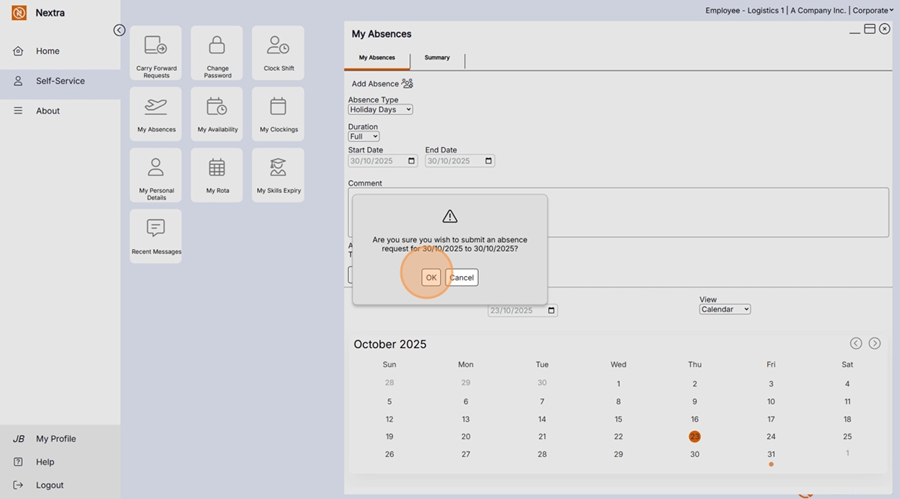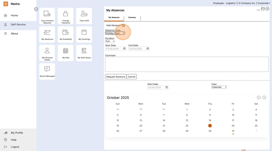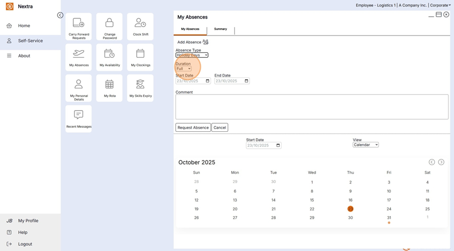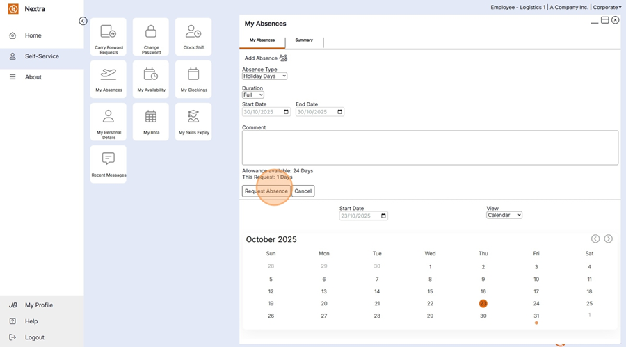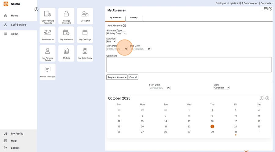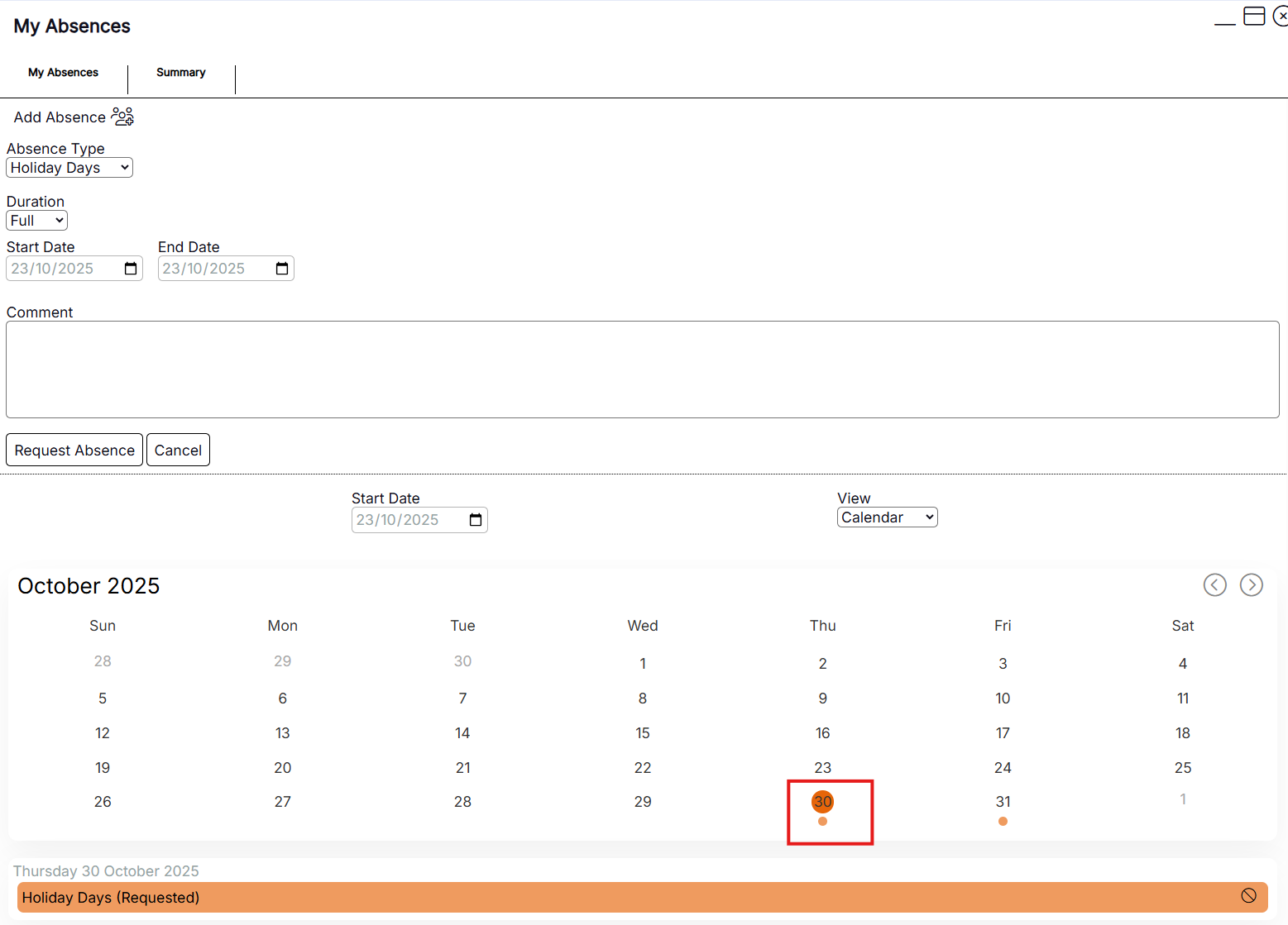 Step 6 - Enter the "Start Date", "End Date" and a "Comment" if you wish and select "Request Absence".