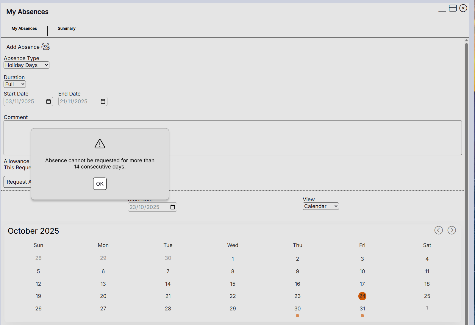 HANDY HINT - The administrator will set the maximum number of days in a row that you are able to make a request for annual leave. If the request you have made exceeds that number of days in a row, you will receive a message similar to this which will prevent you from making the request. If your request is a special case, please speak to your manager as this will need to be booked manually on your behalf.