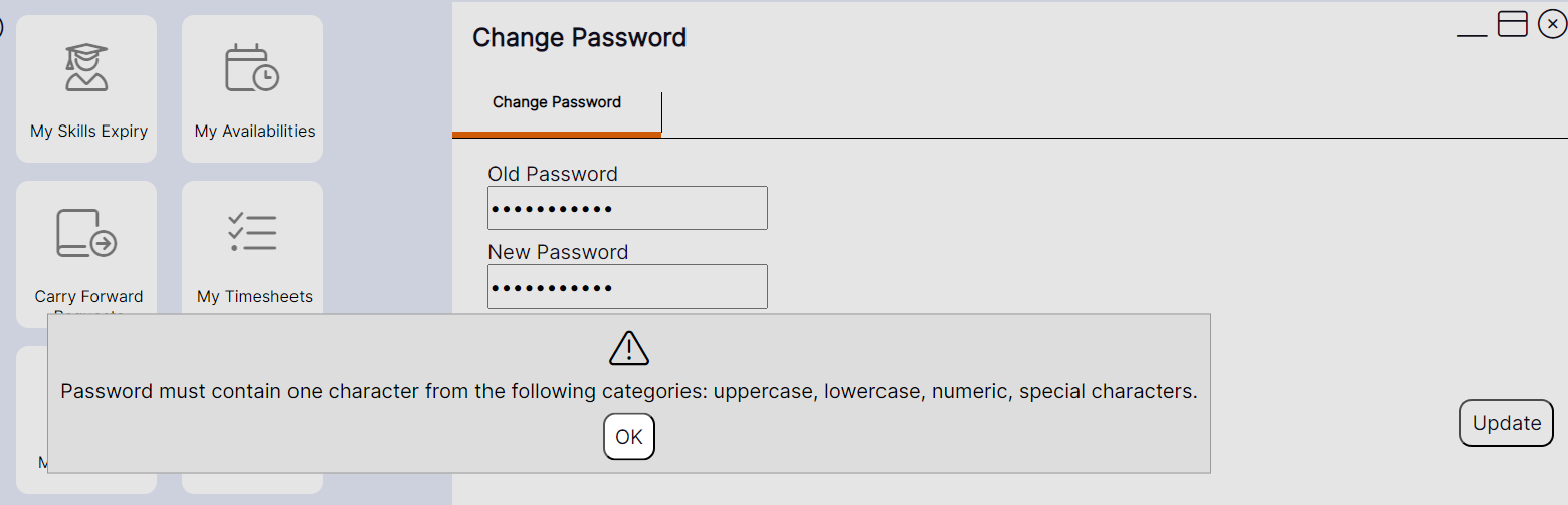 HANDY HINT - Your new password must meet the minimum requirements as follows: 8 characters including at least one number, lowercase letter, and an uppercase letter. If this isn't met the below warning pop up will show.