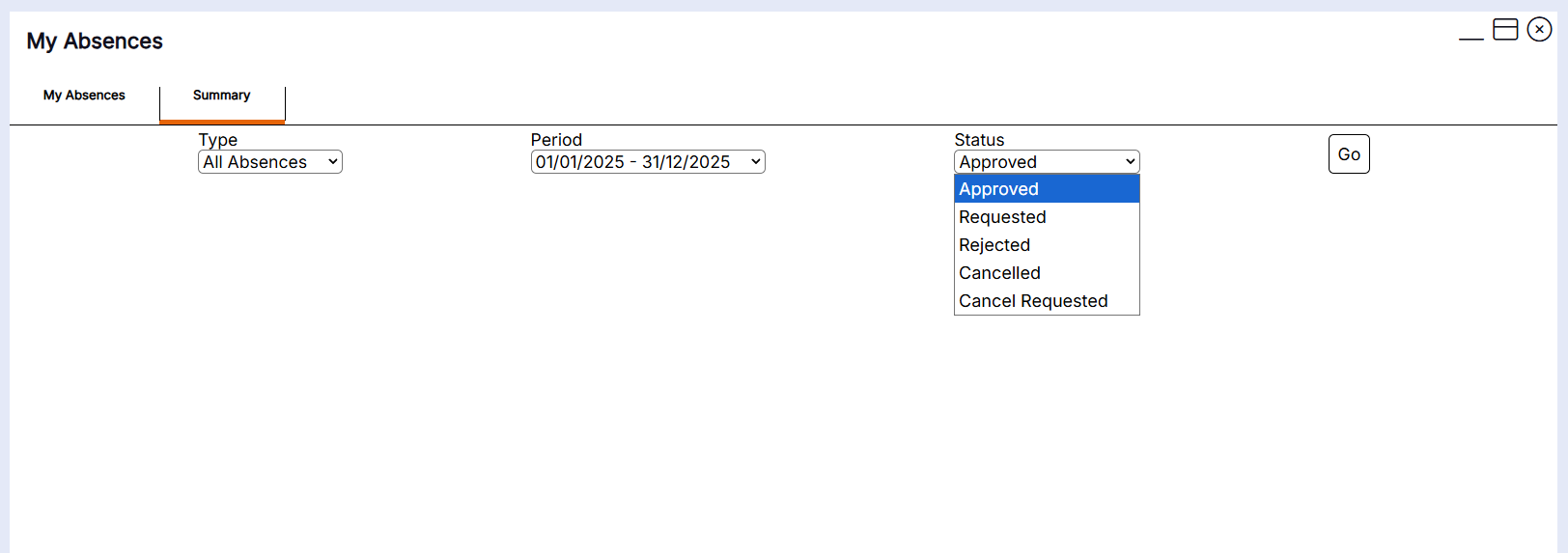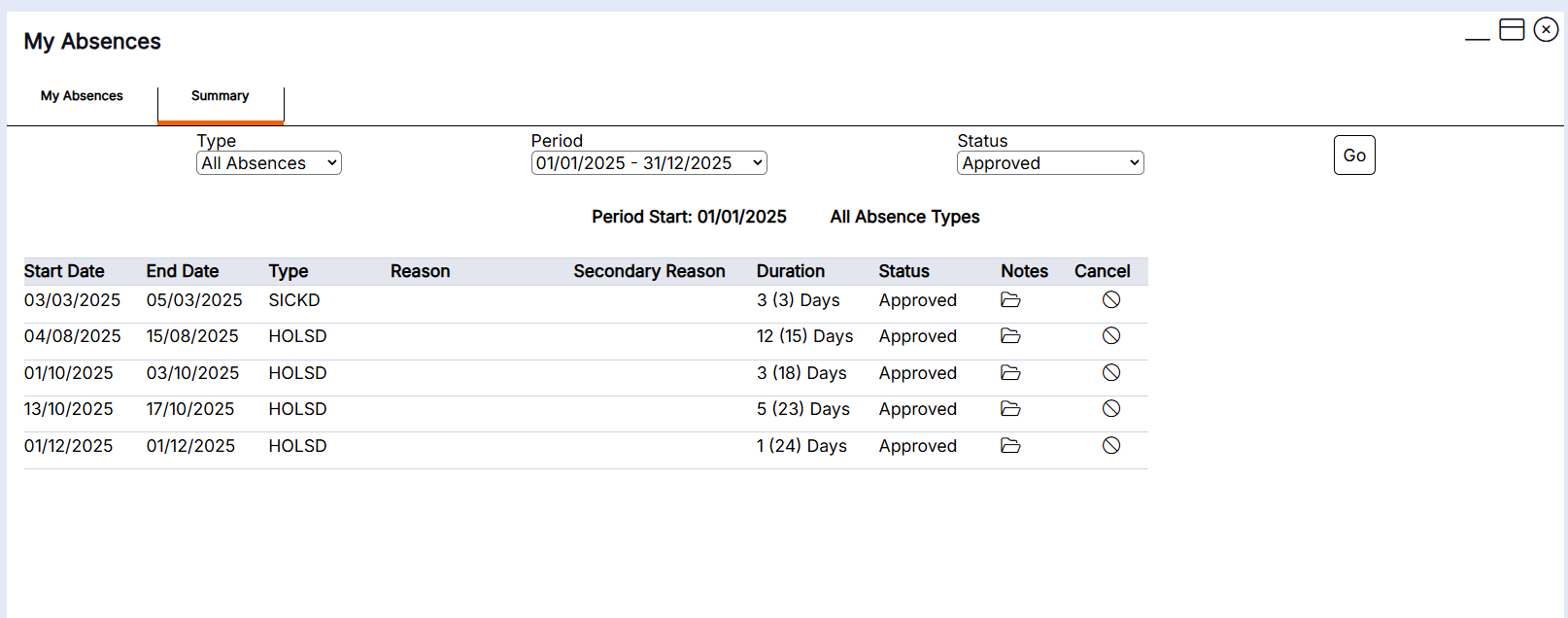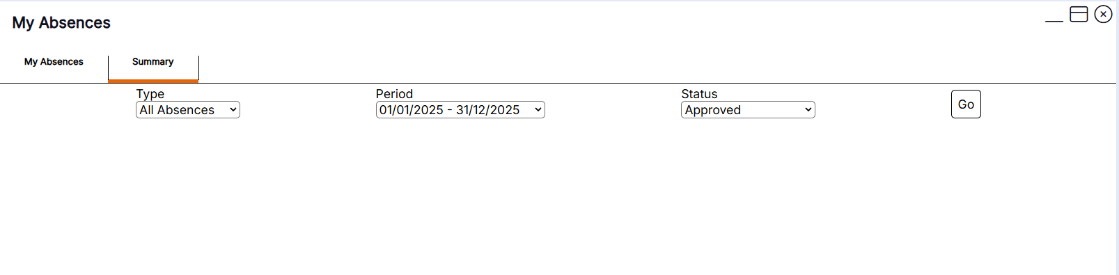 Step 4 - Within the summary screen you can select the Absence type to be viewed or leave the Type to all absences and the report will show them all.
