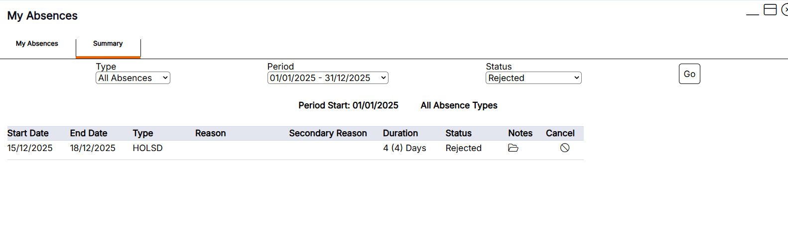 Rejected: Your line manager has rejected your request for leave. If a folder icon displays in front of the status, click on It to see if you have been left a message to confirm the reason for rejection.