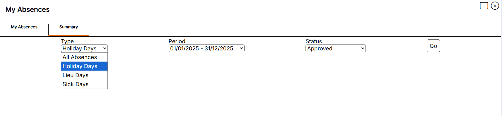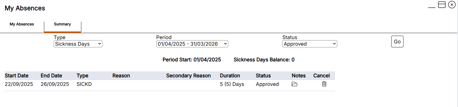 You may also wish to see detail on how many absences are booked on your record within the system, for absence types that do not have a balance, for example, sickness or jury service. To do this, follow steps 1-4 again, but instead choosing a different absence type from the "Type" drop-down menu.
