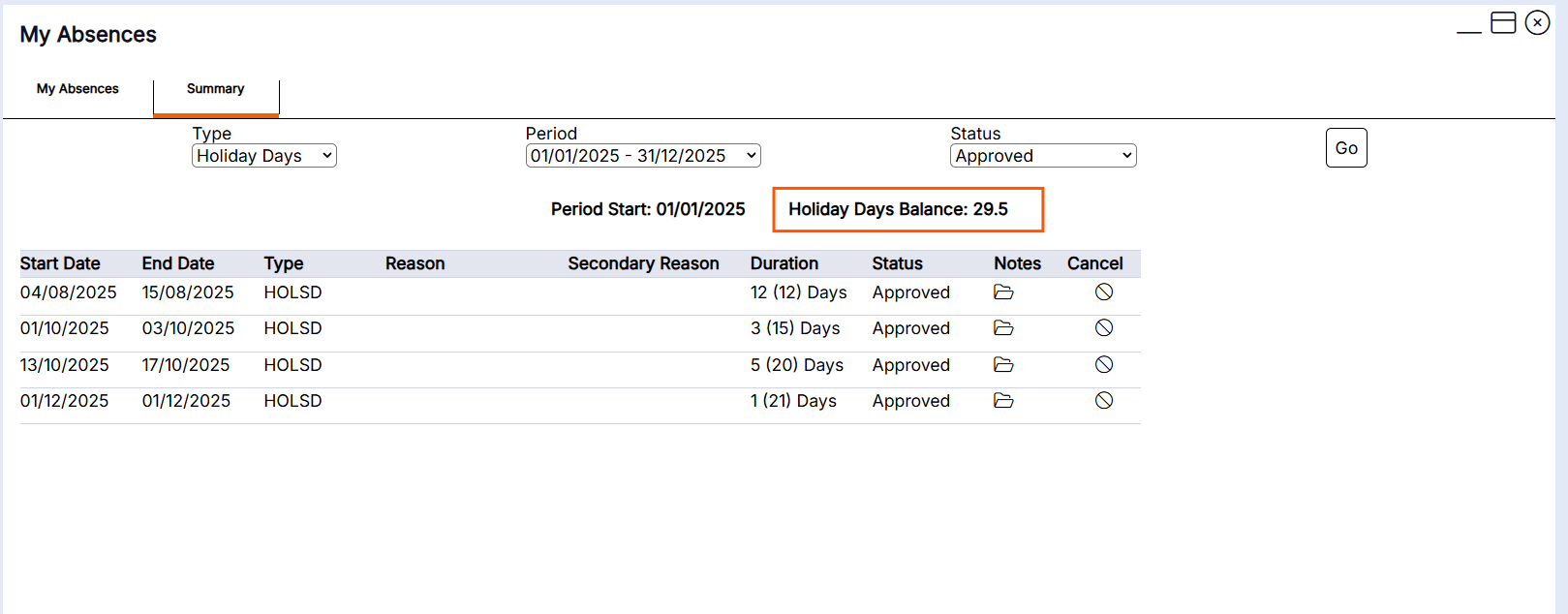 You can use the "My Absences" tab to view the remaining balance of each absence type that has a balance associated to it (i.e. annual leave/holiday/lieu for example) for each leave period (leave year). To view your remaining balance, follow these steps below.