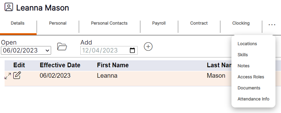The "Attendance Info" tab allows the user to report on a staff member’s absences by the leave period defined in the system, clocking (times they have clocked against their planned shifts), and adjustments (differences between planned shift times and time worked on the day) in the system. To view any of this information, users should follow the steps documented in each section below.