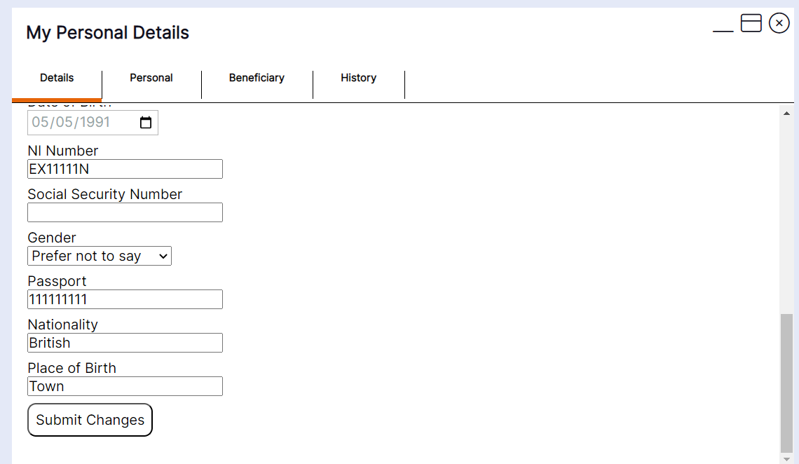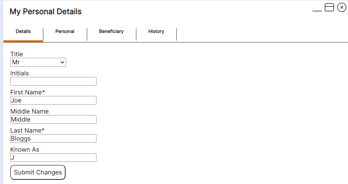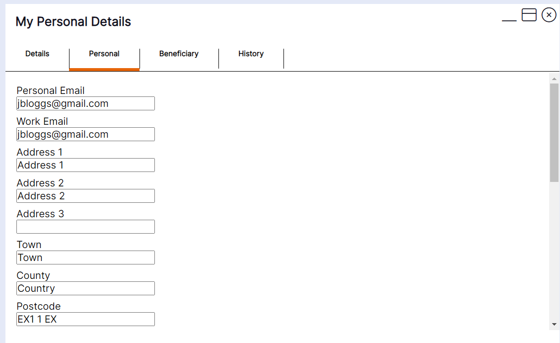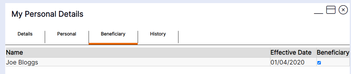 This tab shows you the active details held on your account for any people you have nominated as next of kin or emergency contact for example. If you have also nominated them as a beneficiary, they will display in the list with a tick against them in the beneficiary column as per this example: