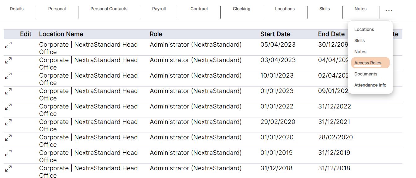 access roles (user types) will be displayed as per the example above. The location name, Start Date and End Date display as set by the user when adding the access role to the staff member.