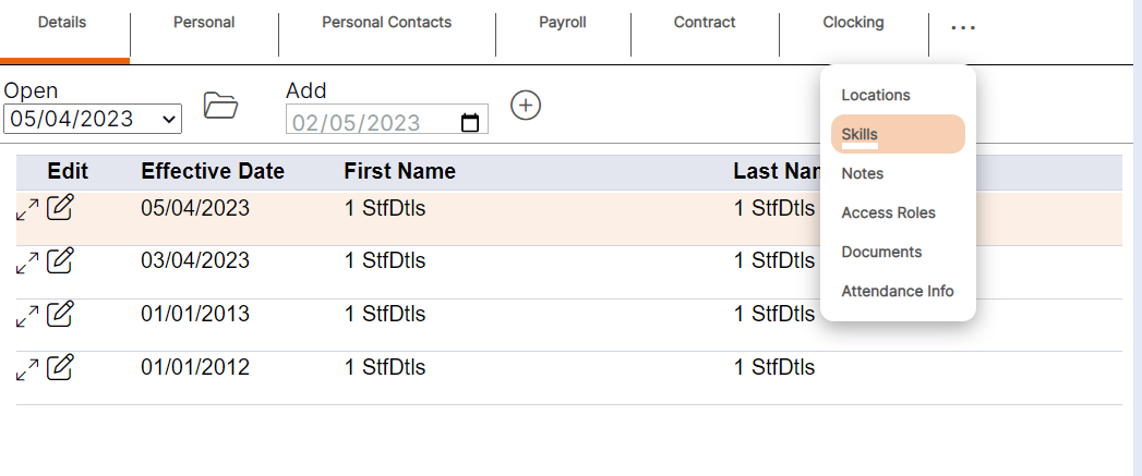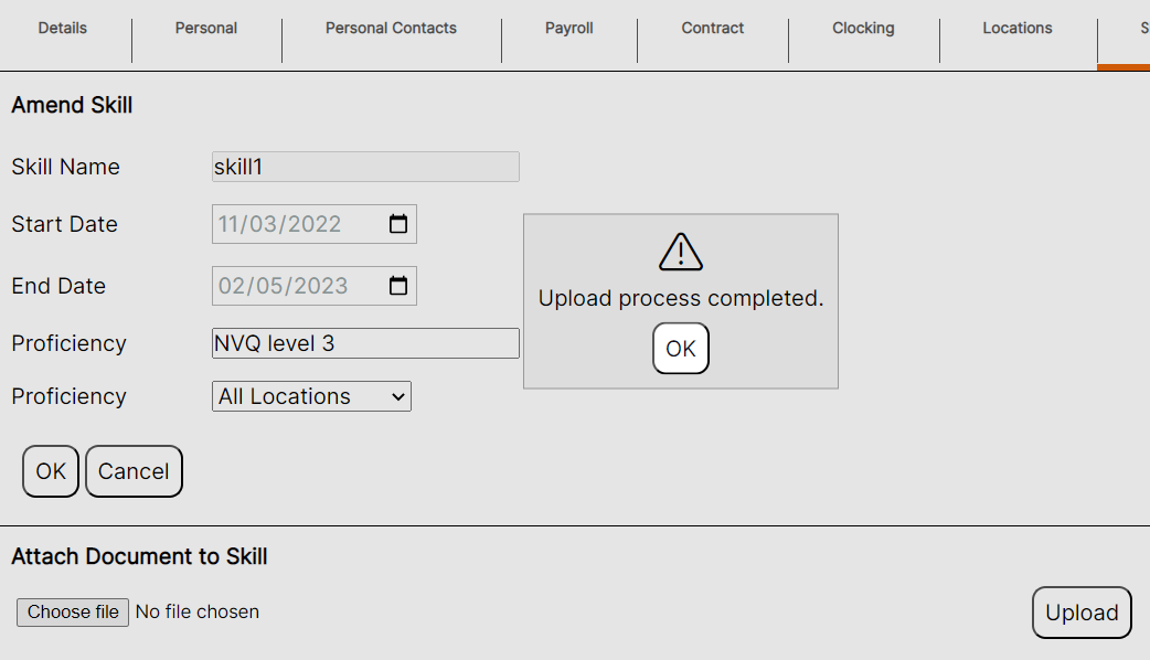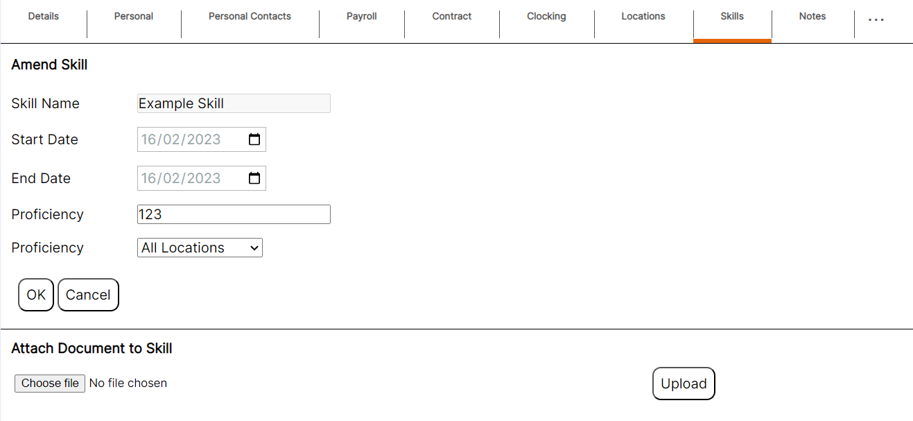 Staff Member Skills Tab – editing existing records, assigning proficiencies and certificates (documents) to a Skill