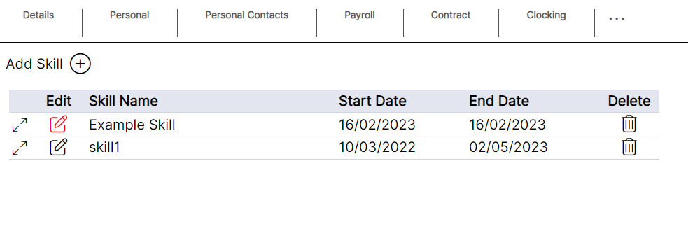 Proficiencies can be assigned to and edited on existing Skill records, or certificates (documents) can be uploaded and associated to a Skill record by clicking on the edit icon, please see below.