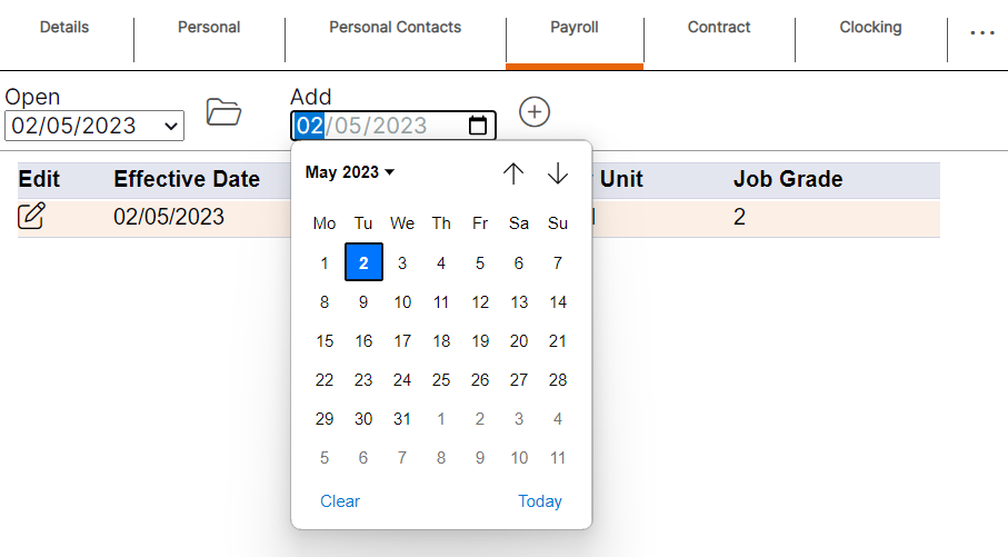 Step 1– Use the calendar icon to select the date the changes are effective from for the staff member in question. Once selected this date will populate in the "Add" field.