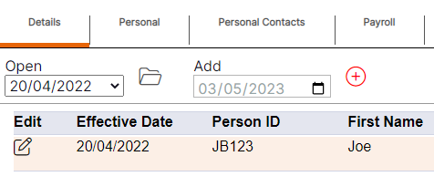 Please note: Once a new record has been saved, it will be available to select in the Open drop-down menu and as an entry on the summary screen, showing the effective date that was entered by the user.