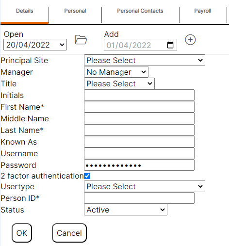 Principal Site– This should be the location where the staff member usually works. Locations can be created at the correct place within the hierarchy, these locations will appear in this drop-down menu. This location is where the staff member will display on the Rota, therefore users should choose their location according to the Rota they wish the staff member to appear on.