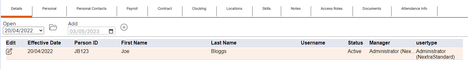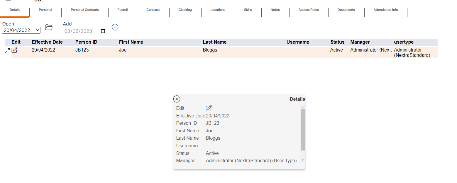 When initially opening a staff member record, the Details tab will display as per the screenshot below. This allows the user to view some of the details of each record quickly and easily without having to open any of the records.
