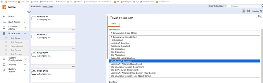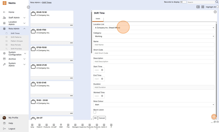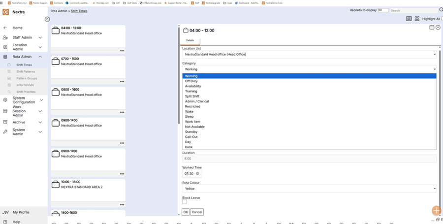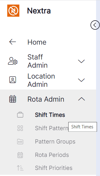 Step 1– Select the "Rota Admin" tab, this will give you a drop down menu where you can then select "Shift Times".