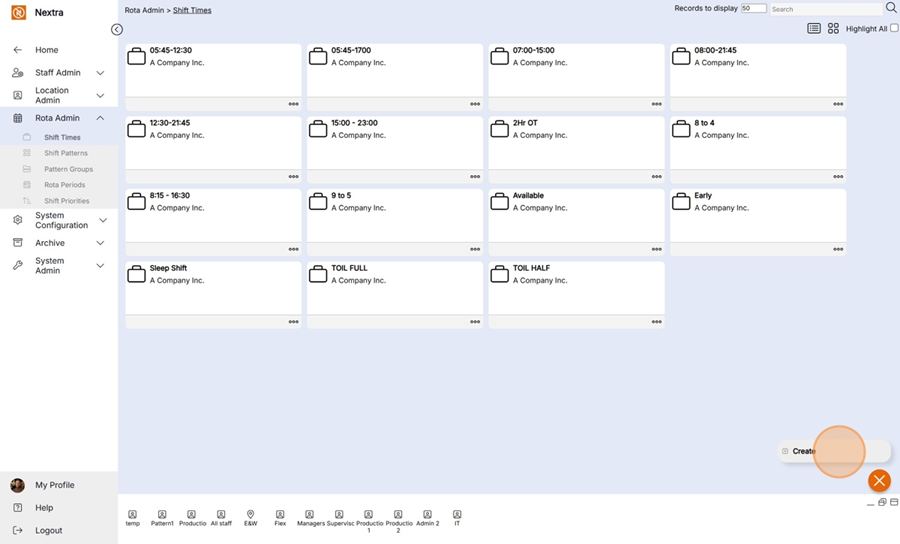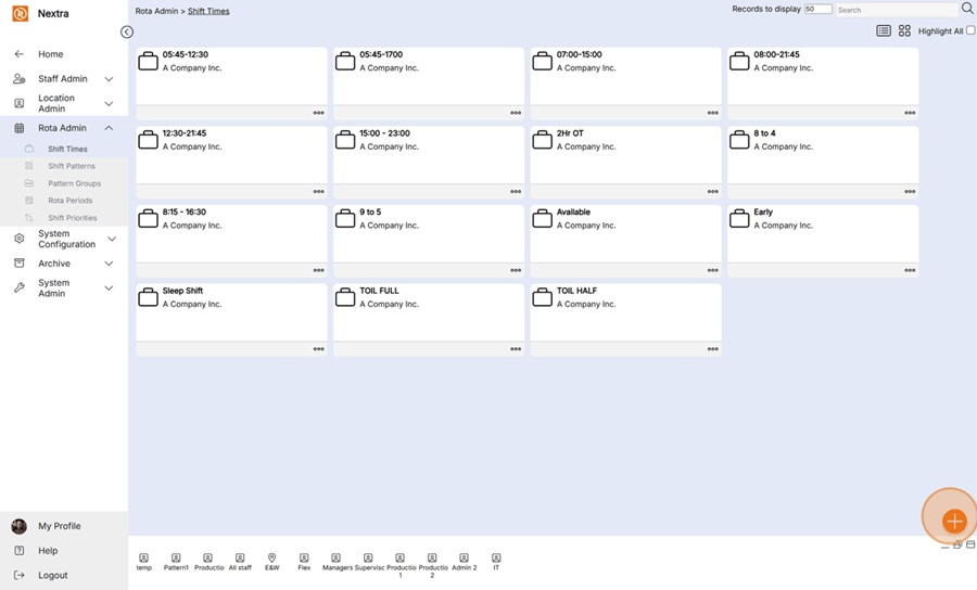 Step 2– Select the Orange + button in the bottom lefthand corner to create a new shift time.
