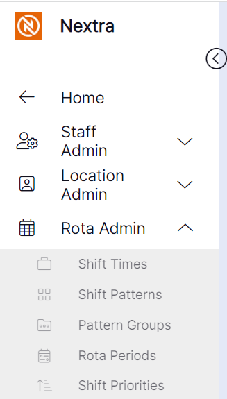 Step 1– Select the "Rota Admin" tab, this will give you a drop down menu for you to then select "Shift Times".