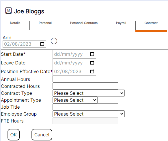 Creating a new record for the Contract tab of a staff member record