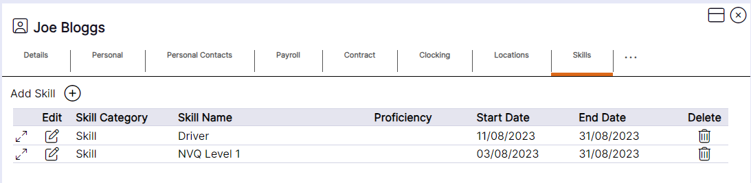 The ‘Skills’ tab on staff member records is used for displaying the current ‘Skills’ and ‘Skill’ history of the employee. ‘Skills’ are used for various distinguishing factors within the system, for example, to confirm if an employee is qualified to work a selected role or to store a certificate/qualification such as a first-aid certificate. This function also allows the system to track any certificates that require renewal by looking at their end dates and reporting them in the ‘Skills Expiry’ ‘Smart Tile’.