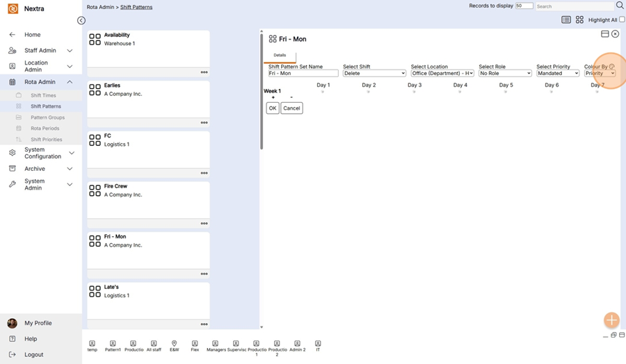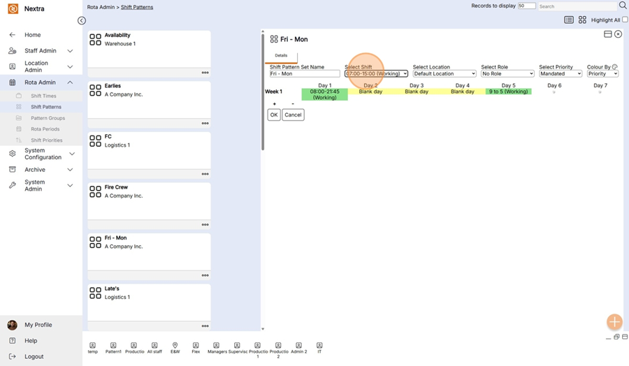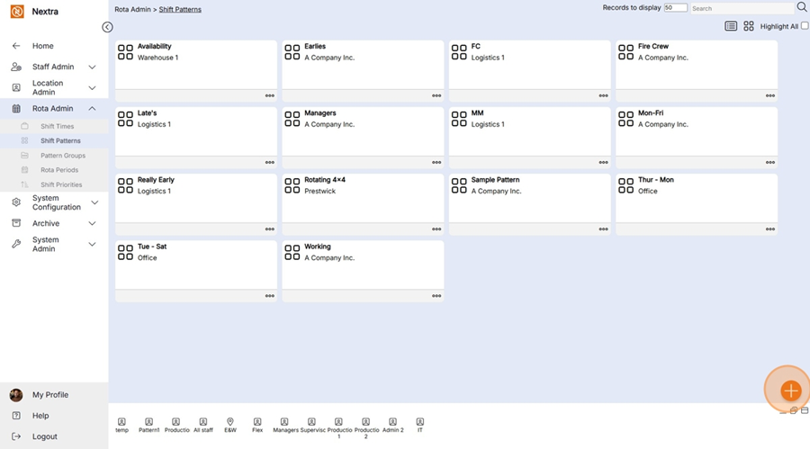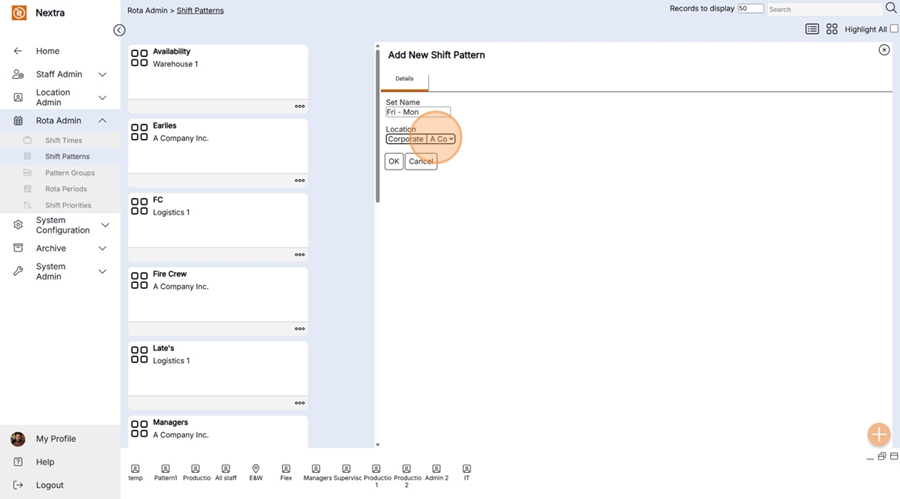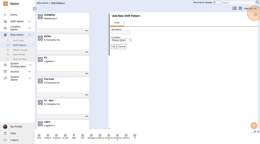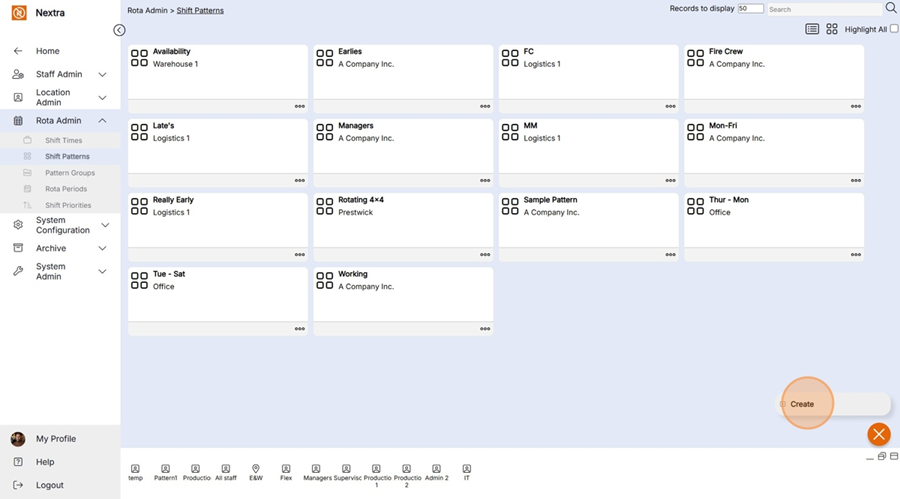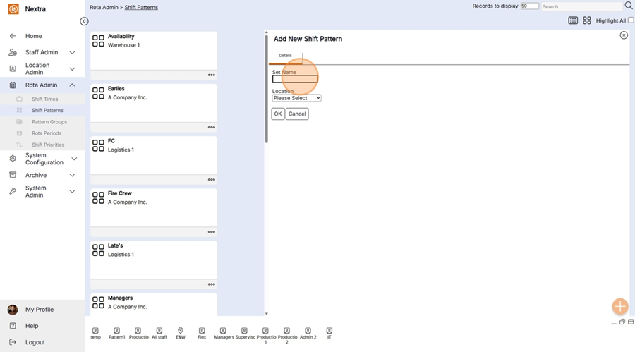 New ‘Shift Pattern’ records can be created in the system using the following steps: