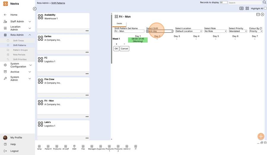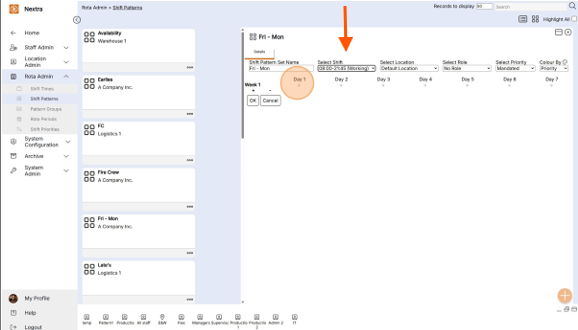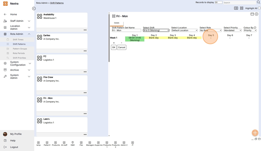 Step 4 - Day 5 is a working day so we go back the select shift drop down and select the shift to be added and click below day 5 to add this to the pattern