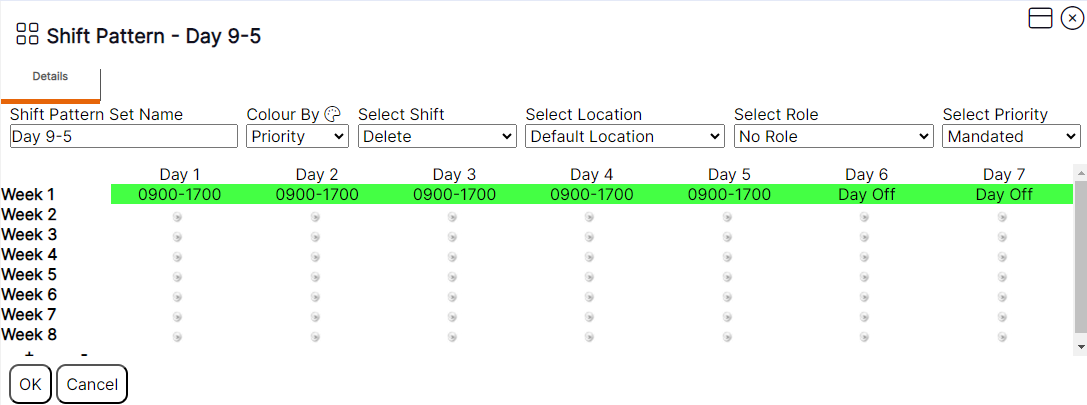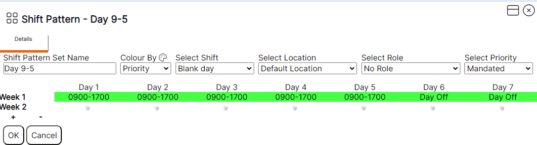 HANDY HINT: Users can only add up to a maximum of 52 weeks to a pattern. The – symbol will only appear to remove weeks from a pattern if the user has reached the maximum of 52 weeks. However, if the user has blank weeks in the pattern with no shifts assigned, once ‘OK’ has been selected the blank weeks will be removed from view.