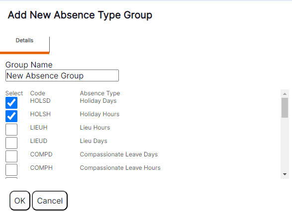Step 5 – Select ‘OK’ to create the new ‘Absence Type Group’.