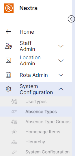 ‘Absence Type’ records are created in order that absence bookings can be assigned to staff members using these types, for example Holiday or Sickness. The ‘Absence Type’ records will also allow you to assign primary and secondary reasons to ‘Absence Types’ that will be available for selection by managers making absence bookings for staff on the ‘Rota’ at the time of booking.