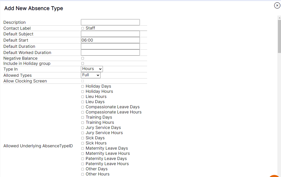 Step 3- Click on the orange X in the bottom right hand corner to create a new 'Absence Type'