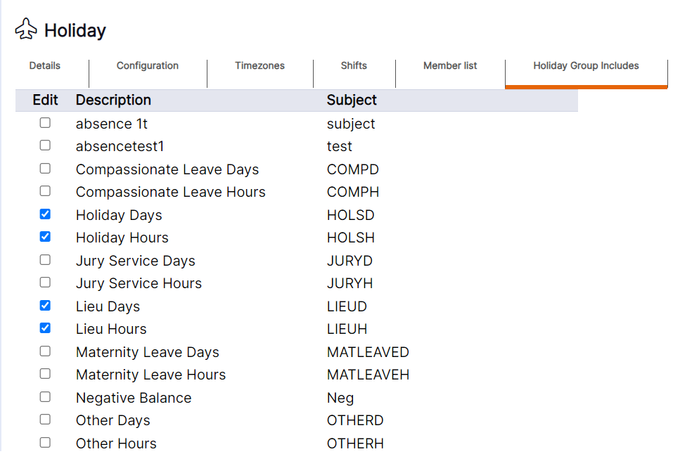 Updating an existing record on the Holiday group Includes Tab of a Holiday group record