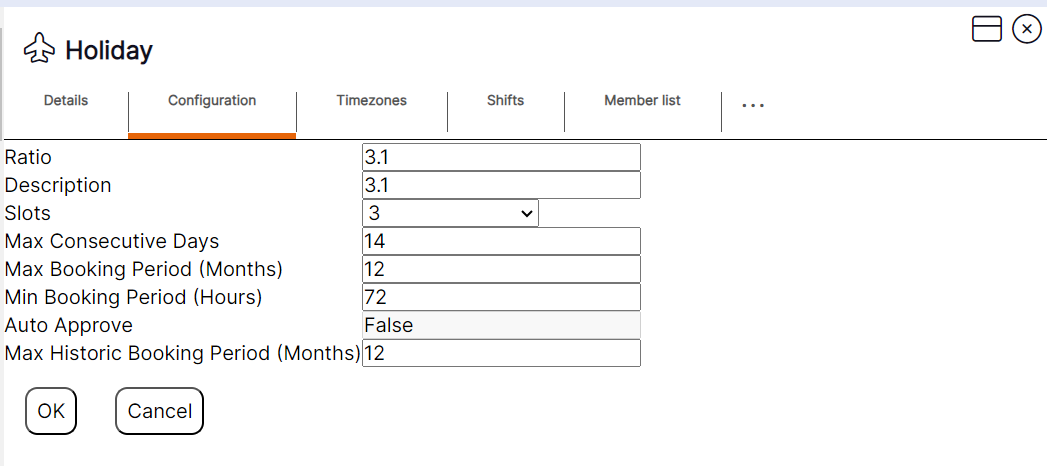 Updating an existing record on the Configuration tab of an ‘Holiday Group’ record