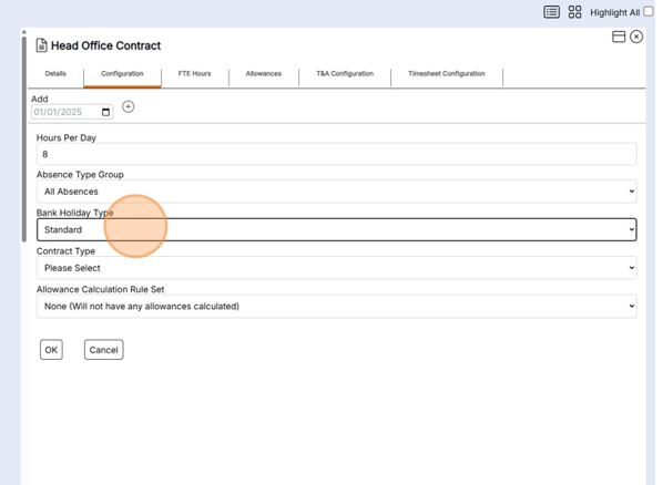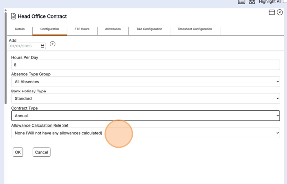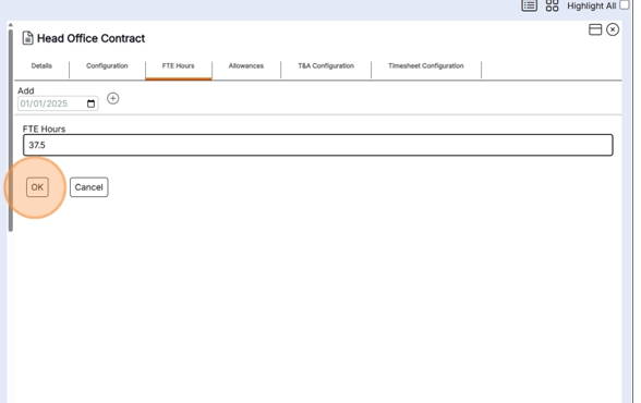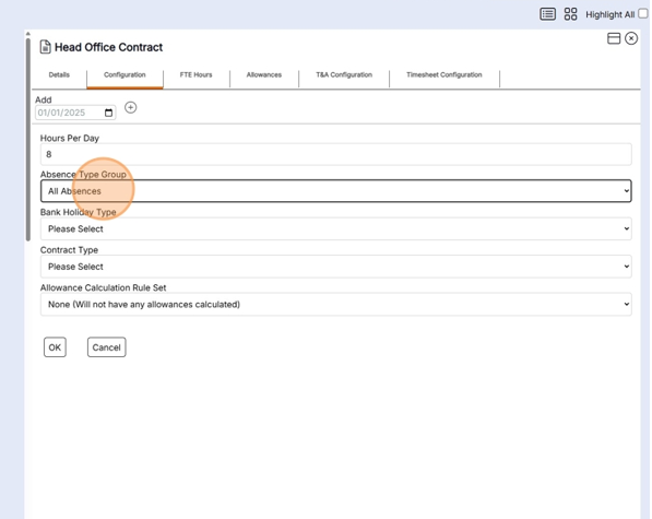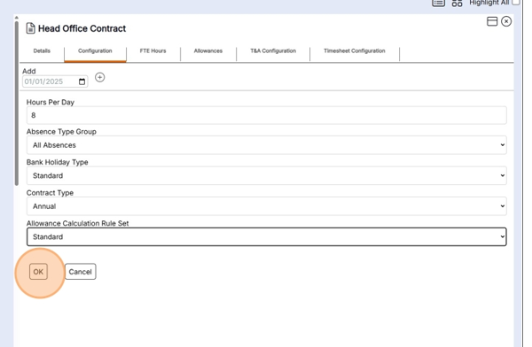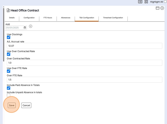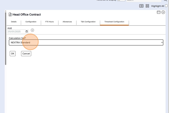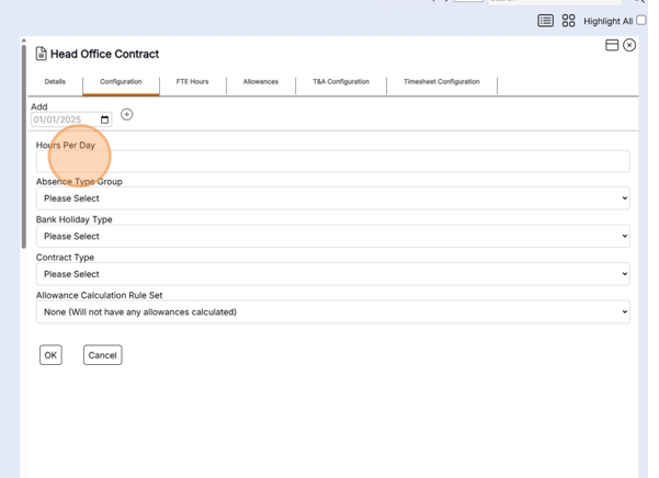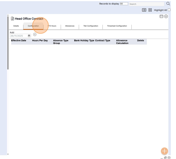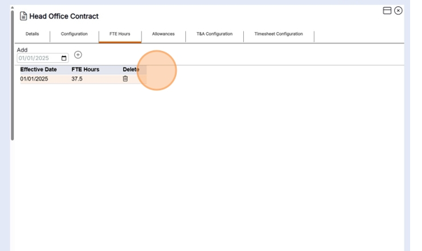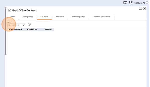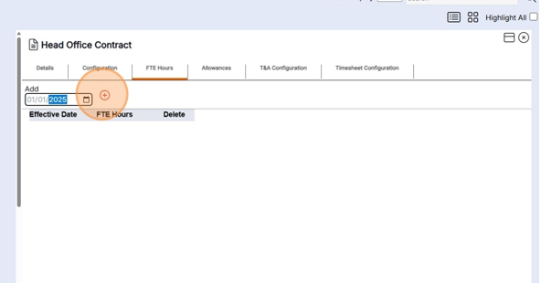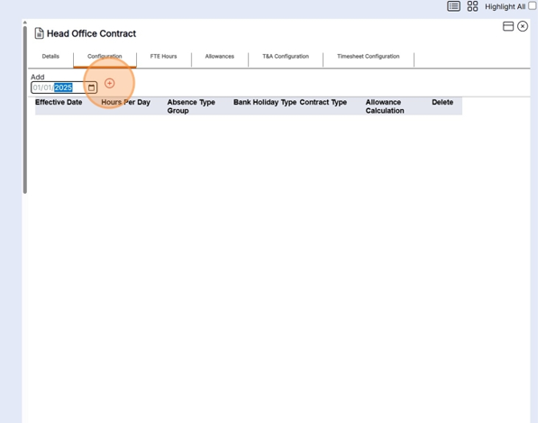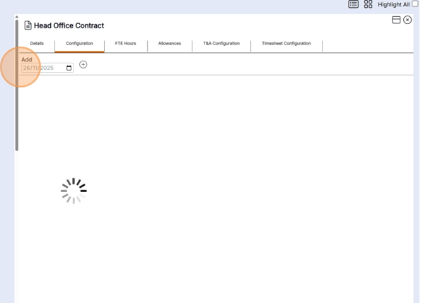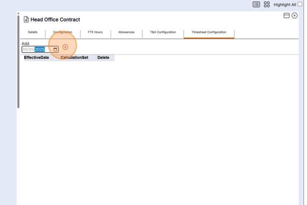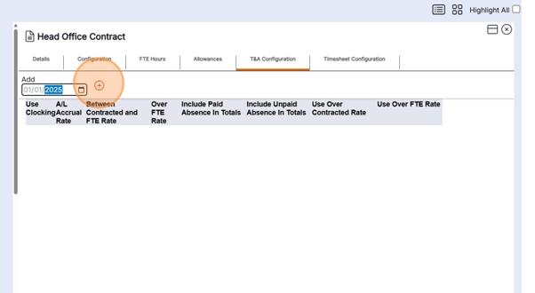 Step 17 - Add the date that the T&A Configurations are to start from & press the + button to save and open the tab