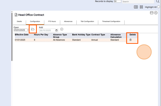 When the record is saved a summary will show on the Configuration tab. To view the details or make changes click the Folder icon. The whole record can be deleted using the bin icon