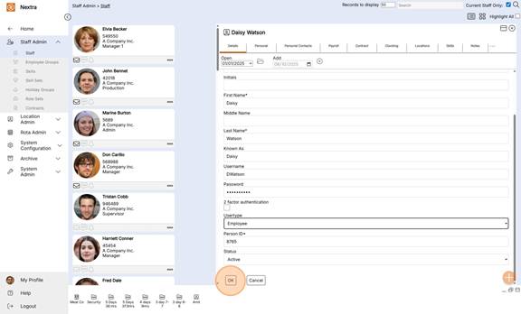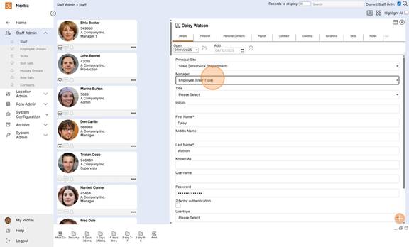 The "Details" tab holds the staff members principal site, log in details and User type information.