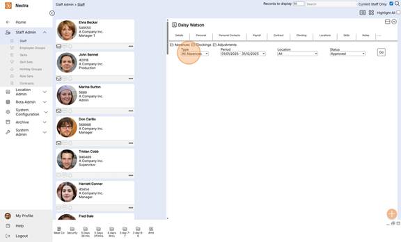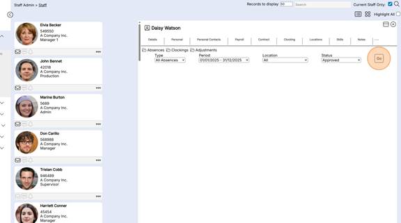 33. On Clicking the Absences folder when adding the search data to these fields a staff members absences can be viewed.