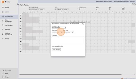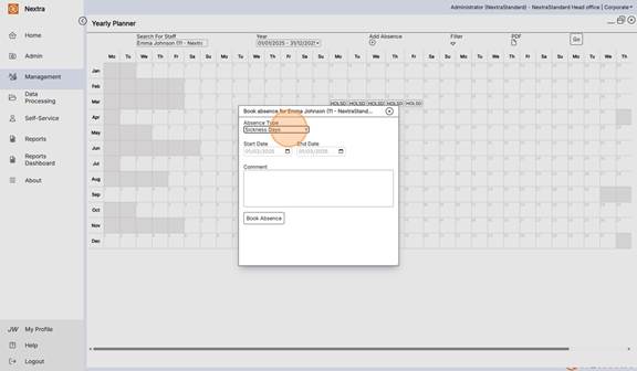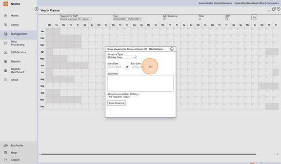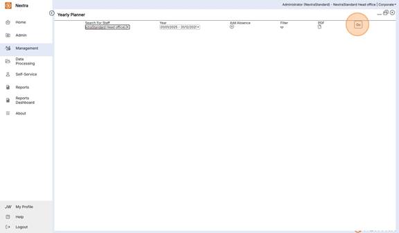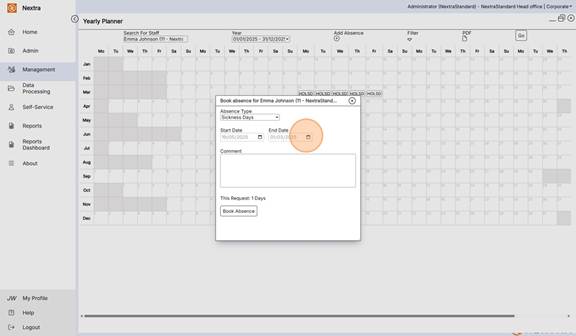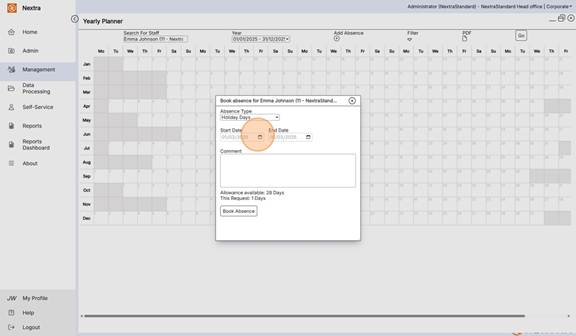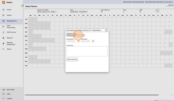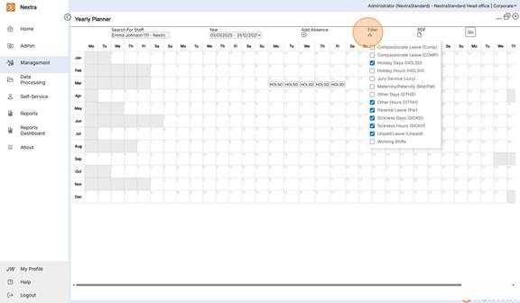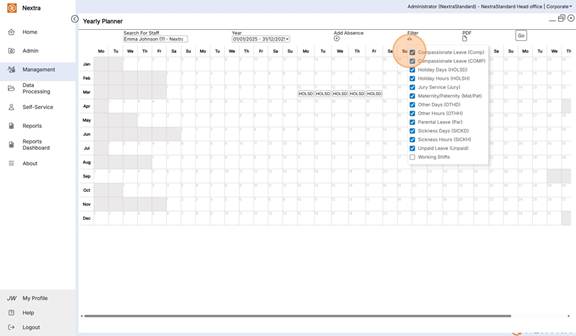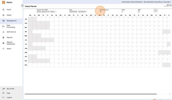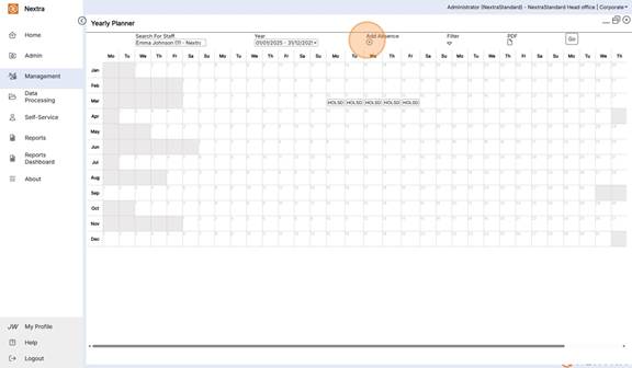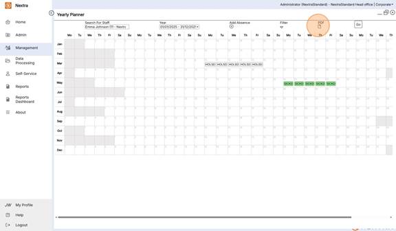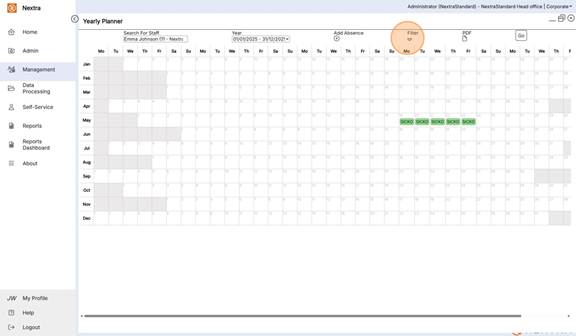The Yearly Planner is an overview of staff absences in a calendar view format. It gives the ability to view, add absences and filter the calendar view to see multiple absence types as well as working shifts.