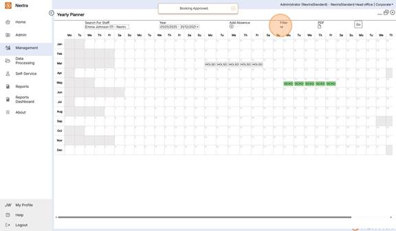 f the staff member has any absences these will show on this screen, depending on which filters are selected.