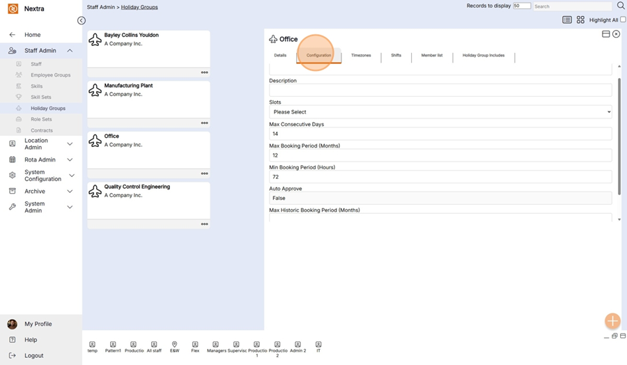 Slots – The user can either select the number of staff who are assigned to this ‘Holiday Group’ that will be allowed on absence per day or select ‘Time zones’ for the ‘Holiday Group’ to operate by. Please note each ‘Holiday Group’ must have at least one ‘Time zone’ allocated on the ‘Time zones’ tab to operate correctly.