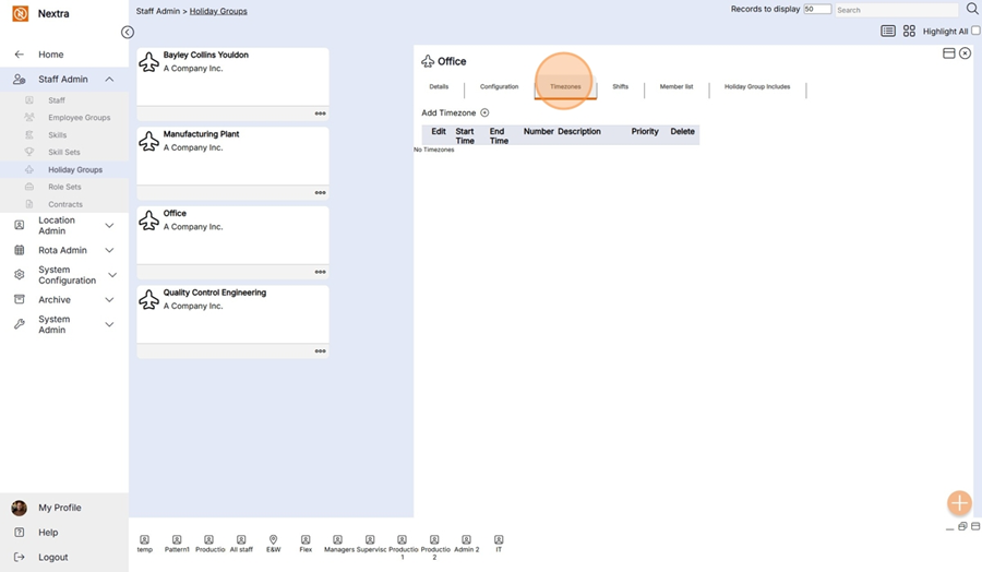 Timezones - The user can select the ‘Time zones’ tab to view and configure the number of absence bookings allowable by number of staff within the ‘Holiday Group’ between particular times in any one day.