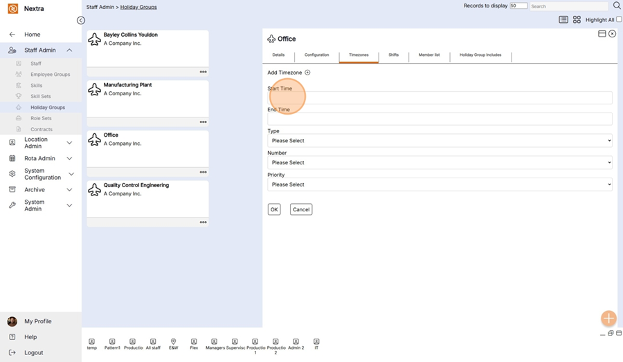 Type – Select the relevant option for the members of this ‘Holiday group’, for example, Starts Within Zone = if a staff member is on a shift that starts within the time of the slot (i.e., between the start and end time you have chosen), and they book holiday, this will take a slot for this time zone. Other available options for selection are as follows: End Within Zone, Majority in Zone, Over Midnight.