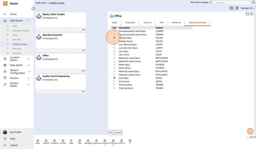 HANDY HINT 2: You can choose to control the number of staff allowed on absence for certain ‘Absence Types’ only within the time zones you are creating, e.g., holiday by using the Holiday group Includes tab.