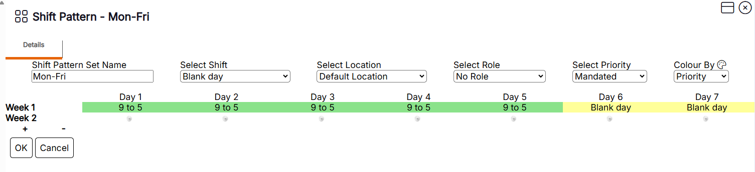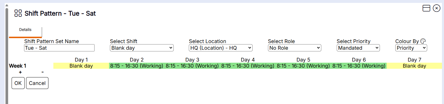 Having a record for each of these priorities in the Admin screen, allows the user to select a colour for each of these, so that they can choose to view the shifts on the "Rota" or within "Pattern Management" in the colours chosen for each of the "Shift Priorities".