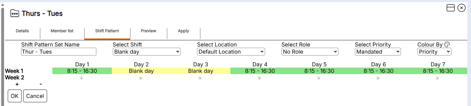 NB In this example the Rota period needs to start on a Monday as the pattern group has been created to start on a Monday