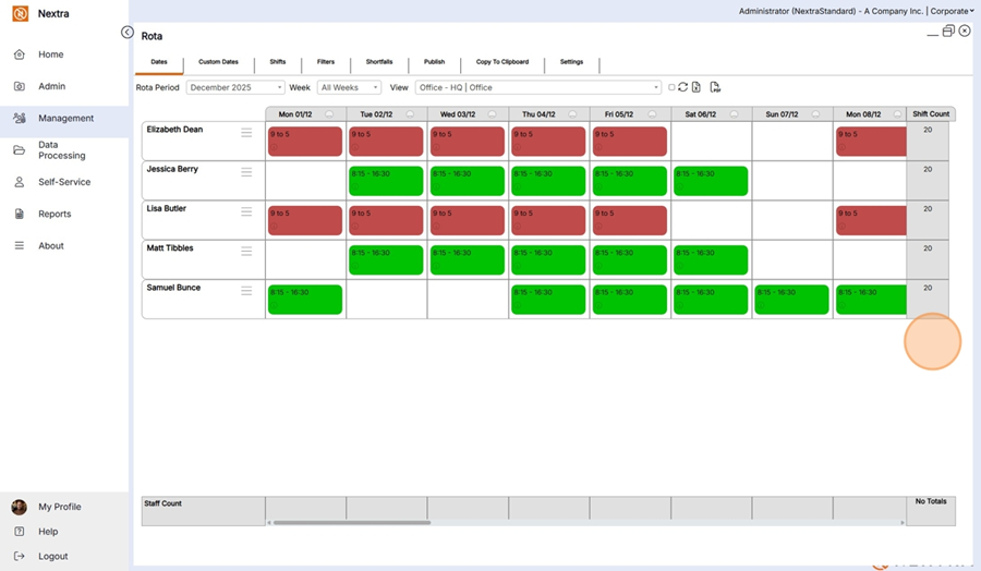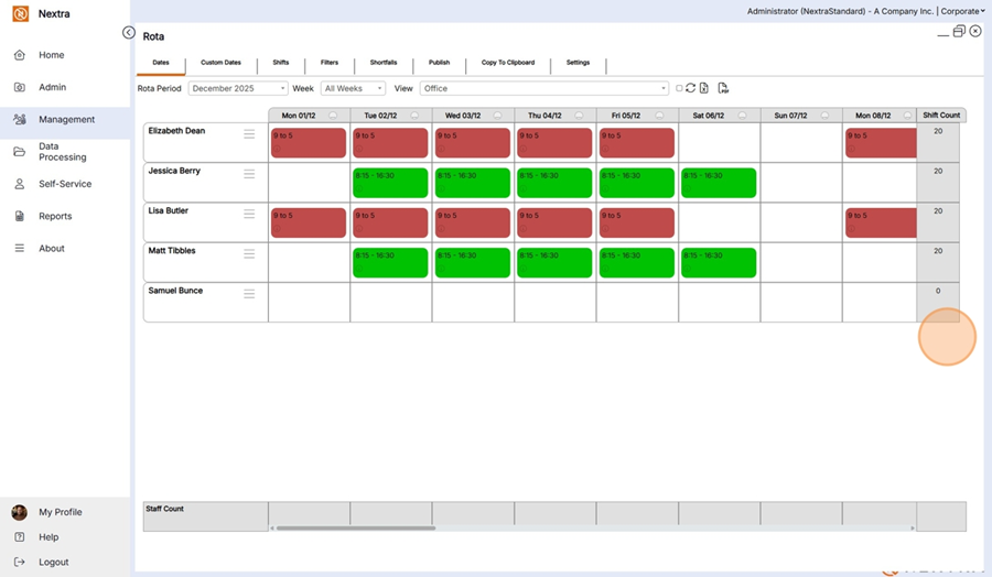 The Rota is where shifts are allocated to staff members and staff members can view their shifts.