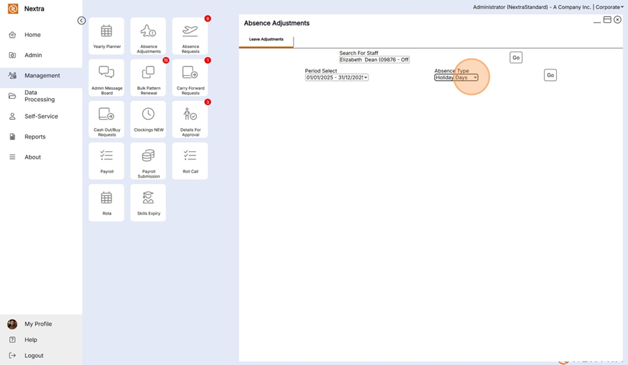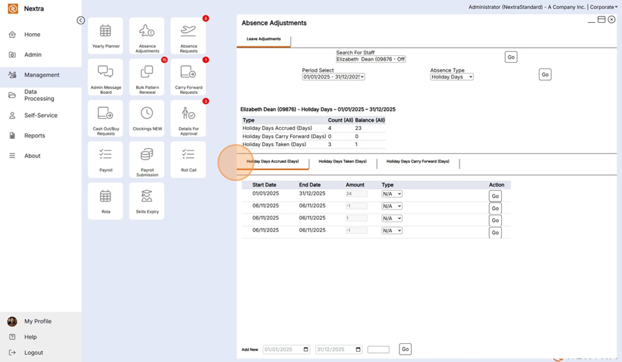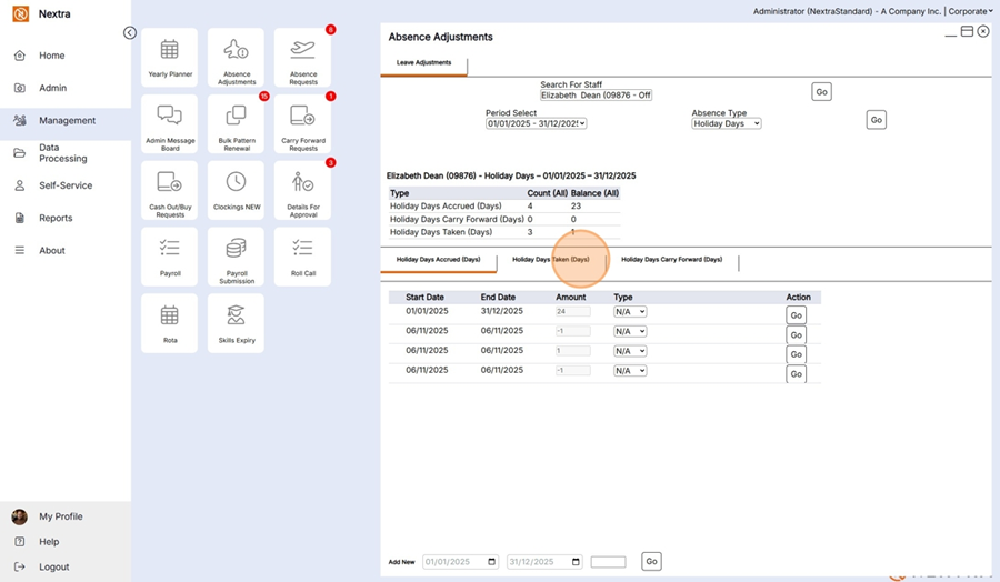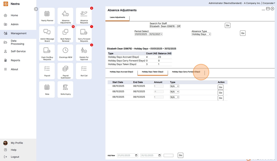 If additional holiday absences need to be added to a staff member they can be added here.