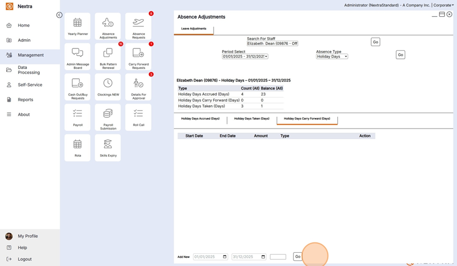 In The Add New at the bottom of the screen add the date range the additional absence is being added for and then the time frame i.e. - 1 day and press go .. this will then add an additional days holiday to the staff members allowance.