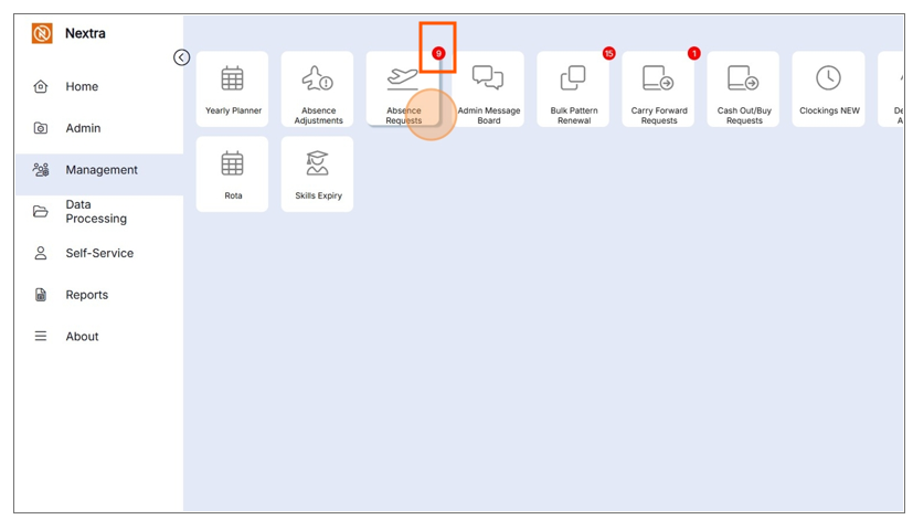 Step 2 - Select Absence requests tile (NB if there are absences to approve there will be a red dot on the tile with the number of absences to approve
