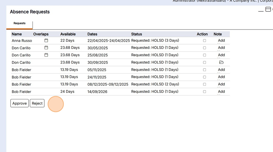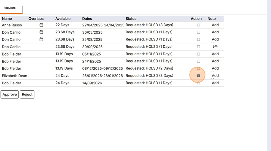 Step 4 - Select the staff member who's absence that is being approved and click the tick box in the Action column