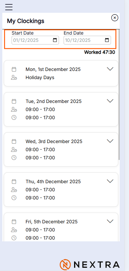 NB The Worked Hours is a total number of hours worked for the Date Range selected and will change when the dates are changed.